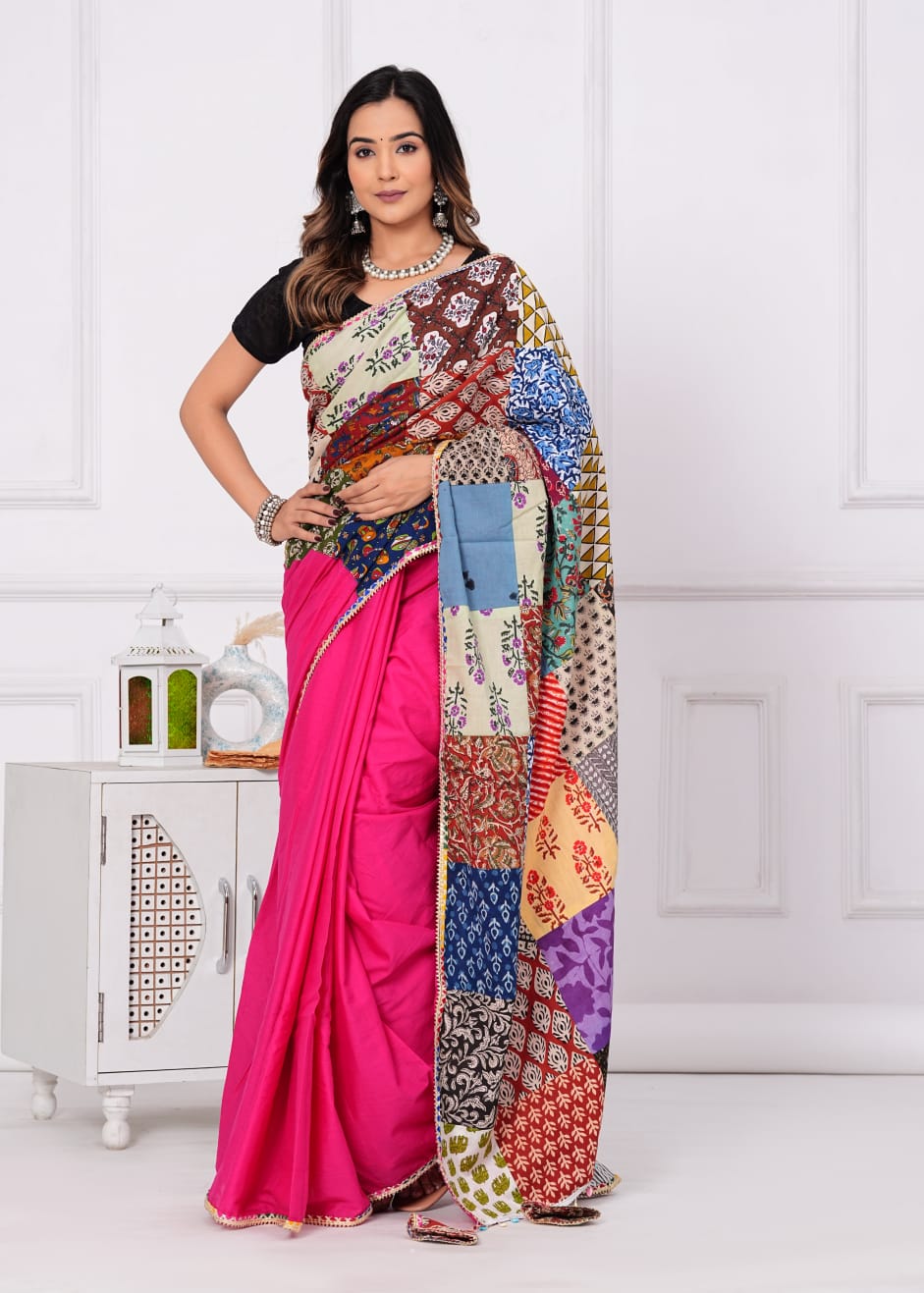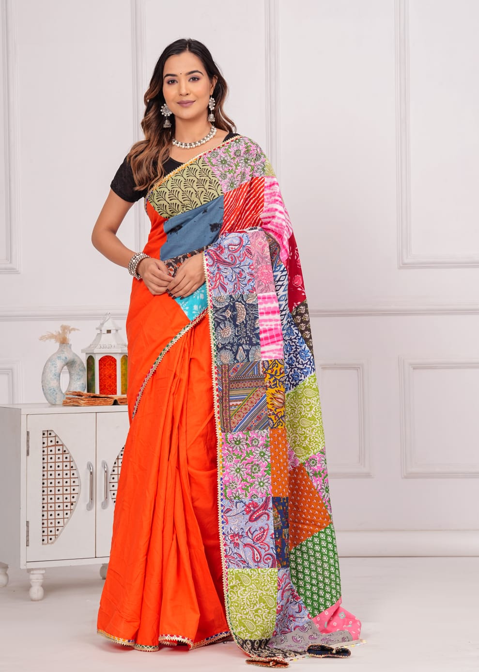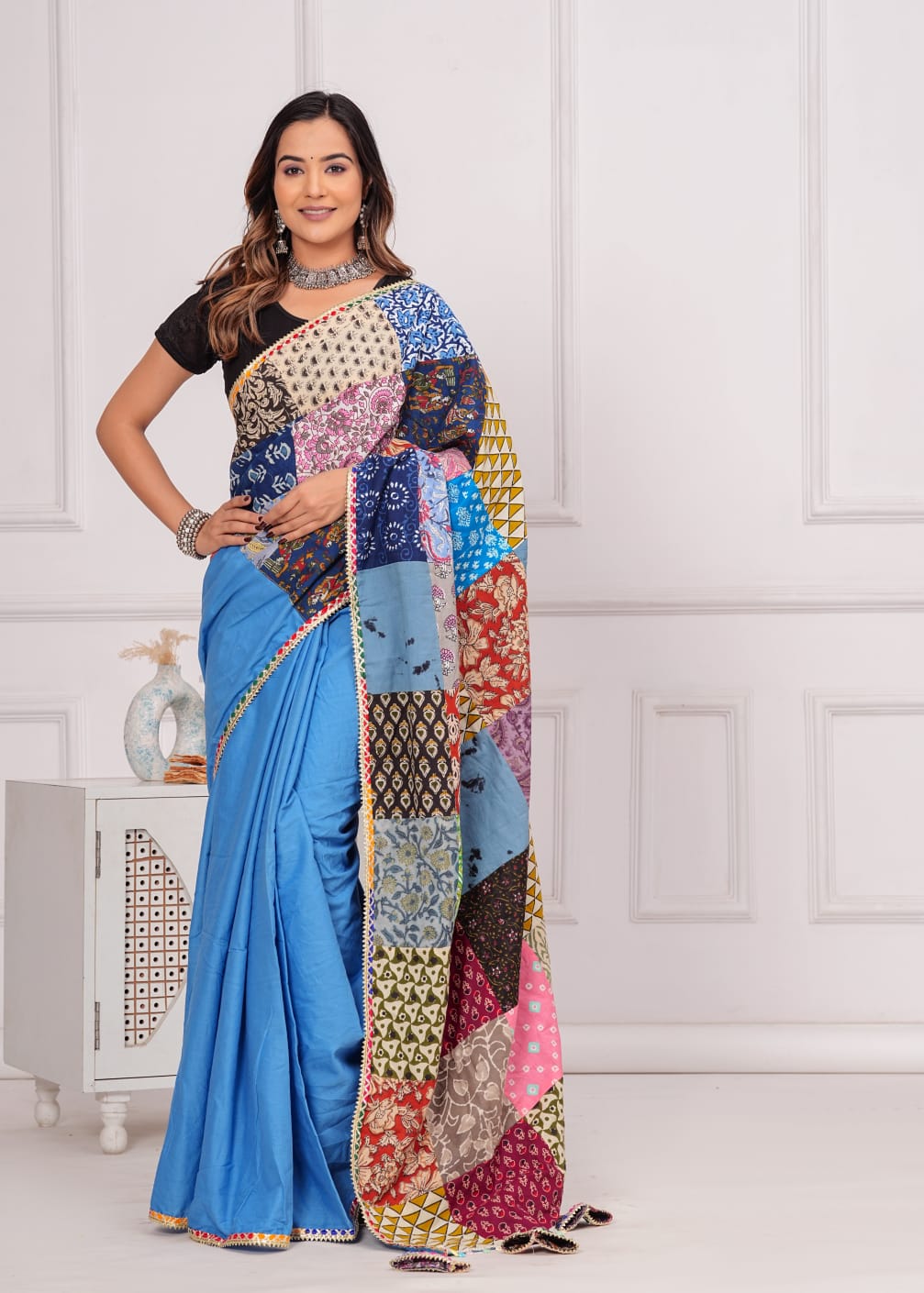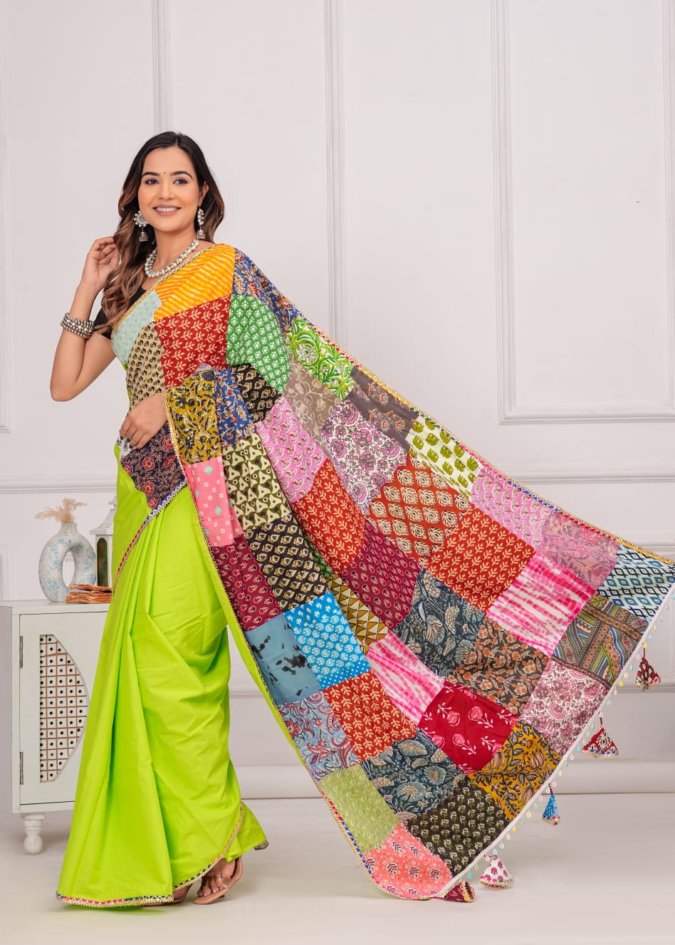 Made from 100% cotton, it combines sophistication with eco-consciousness. Each saree is distinctive with vibrant patches, promoting sustainable fashion. Specifications: