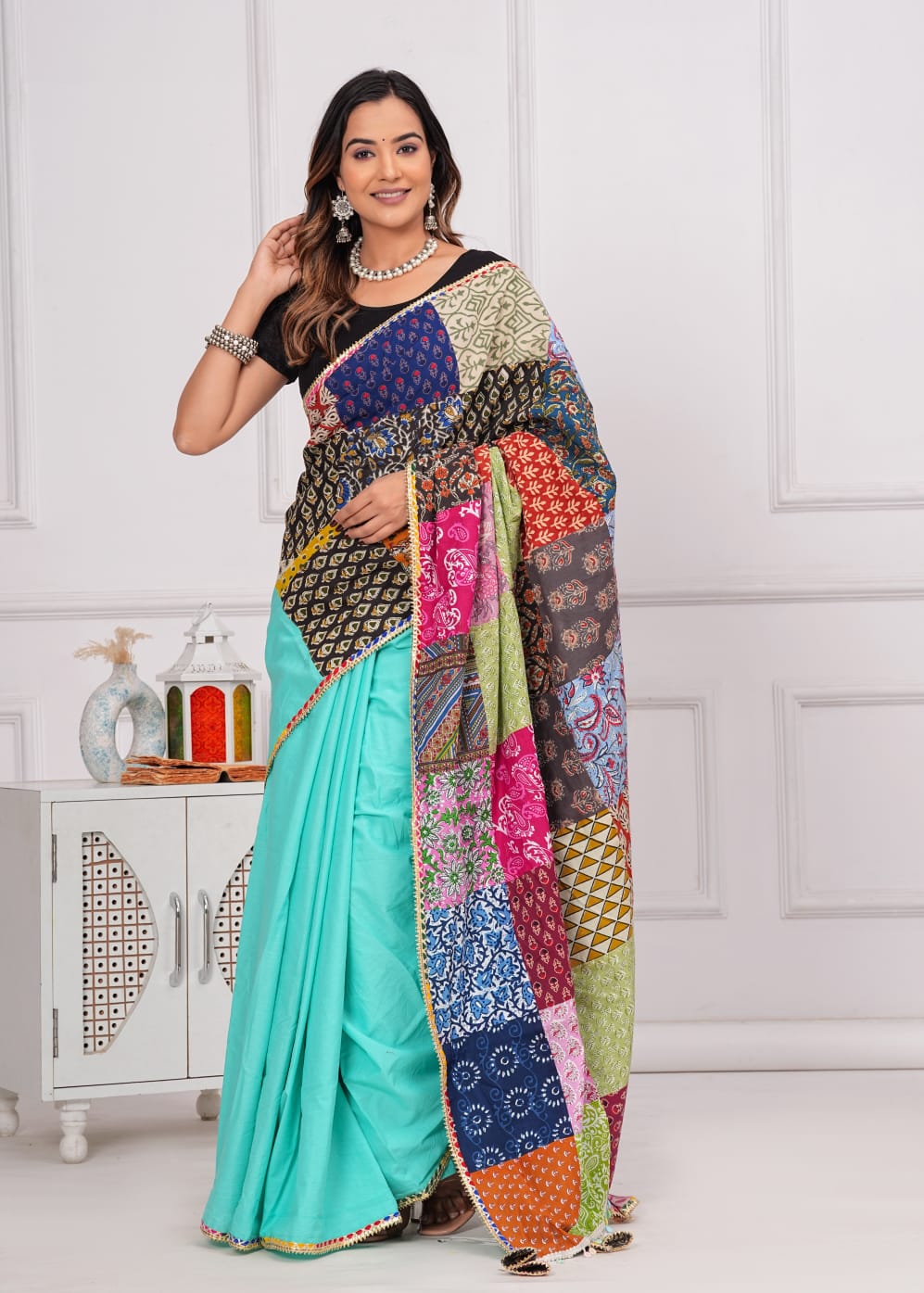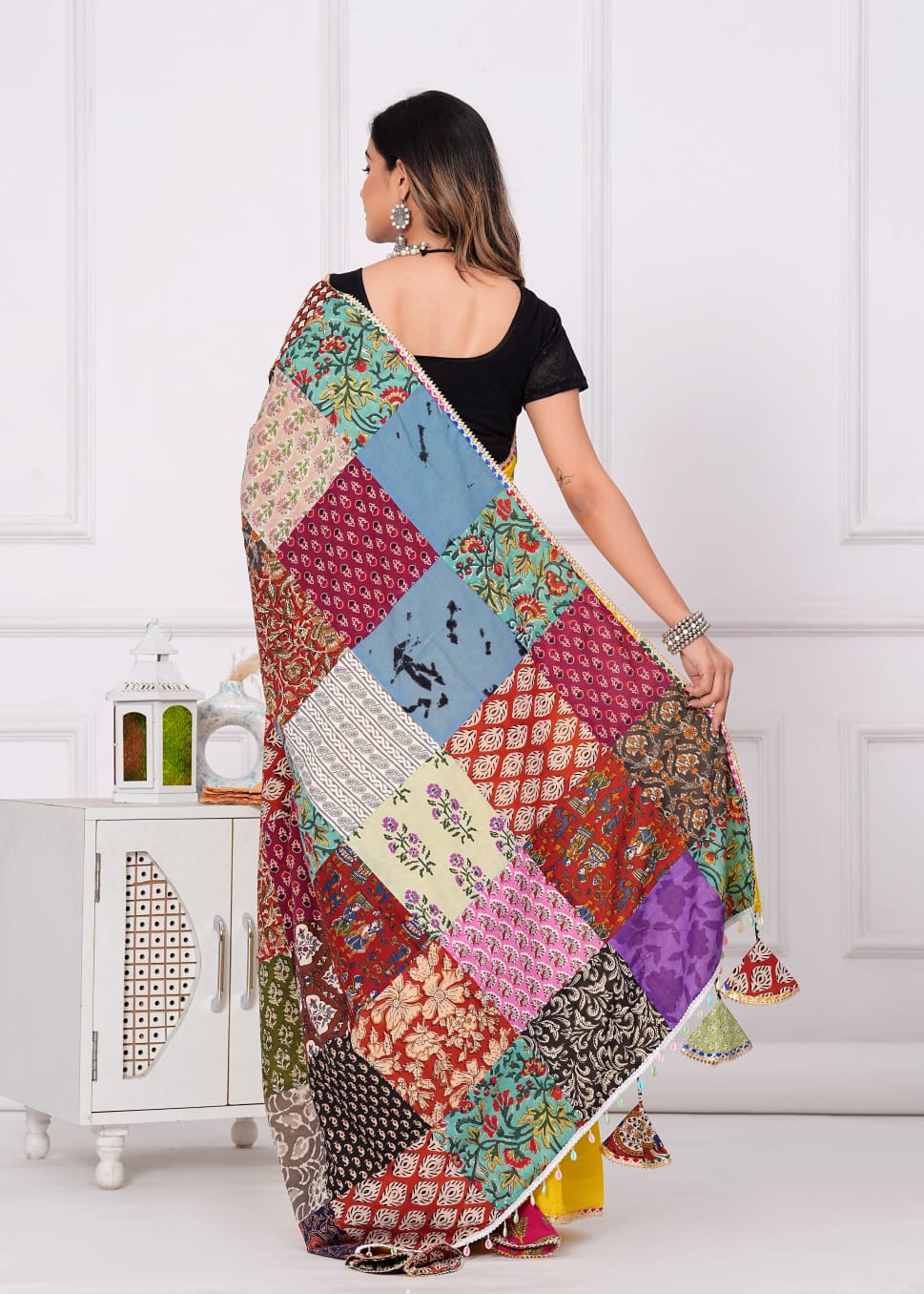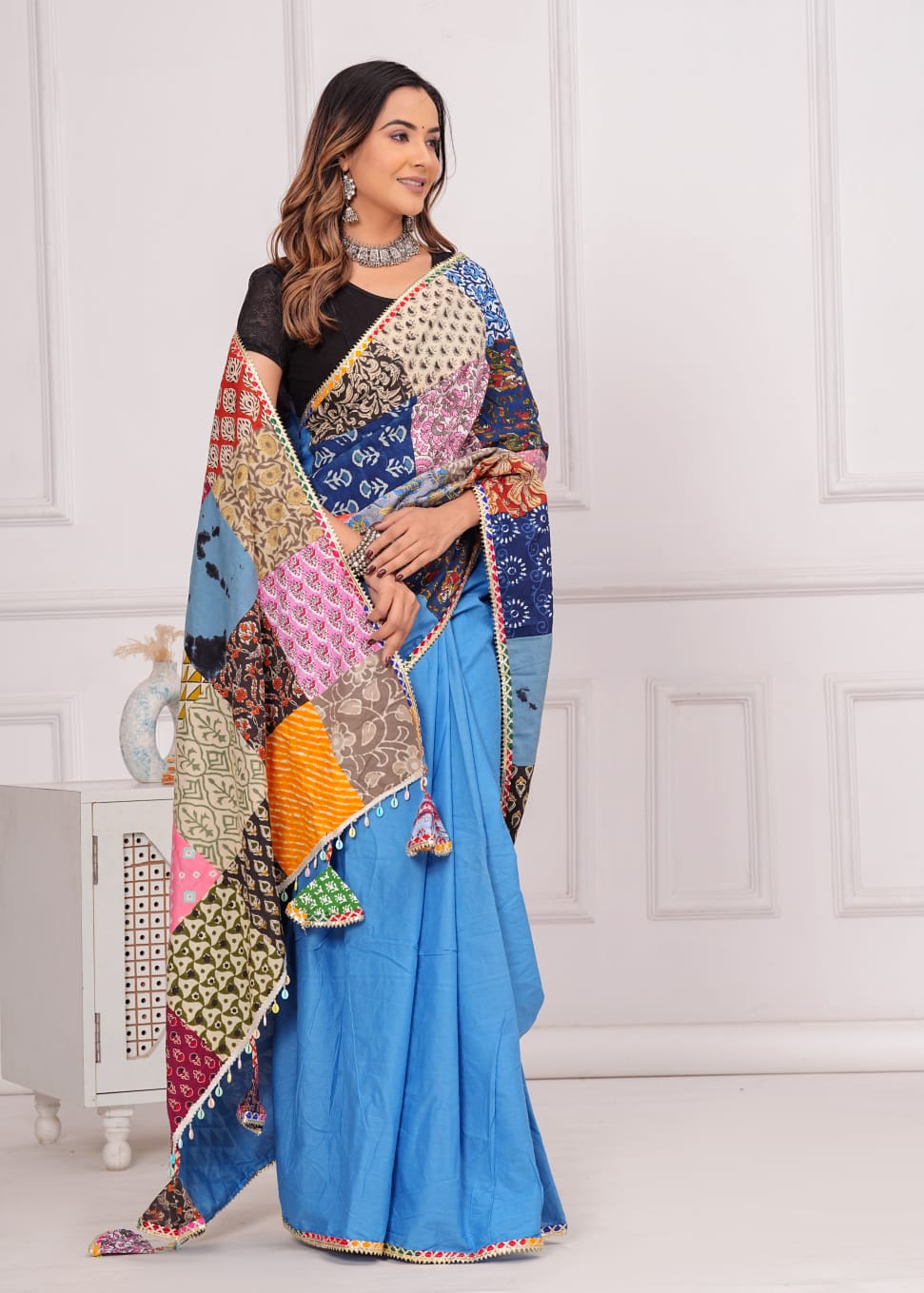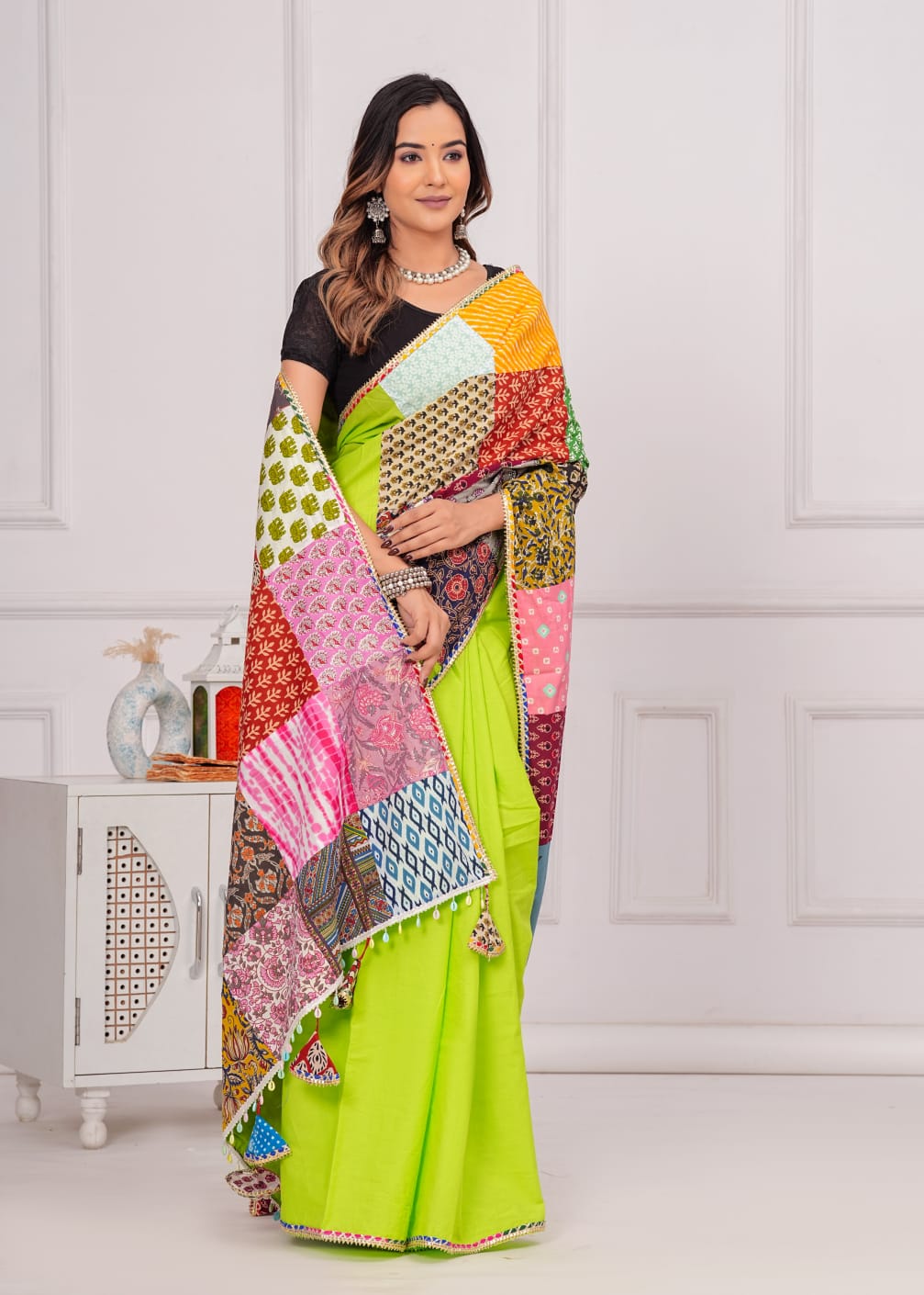 Made from 100% cotton, it combines sophistication with eco-consciousness. Each saree is distinctive with vibrant patches, promoting sustainable fashion. Specifications: