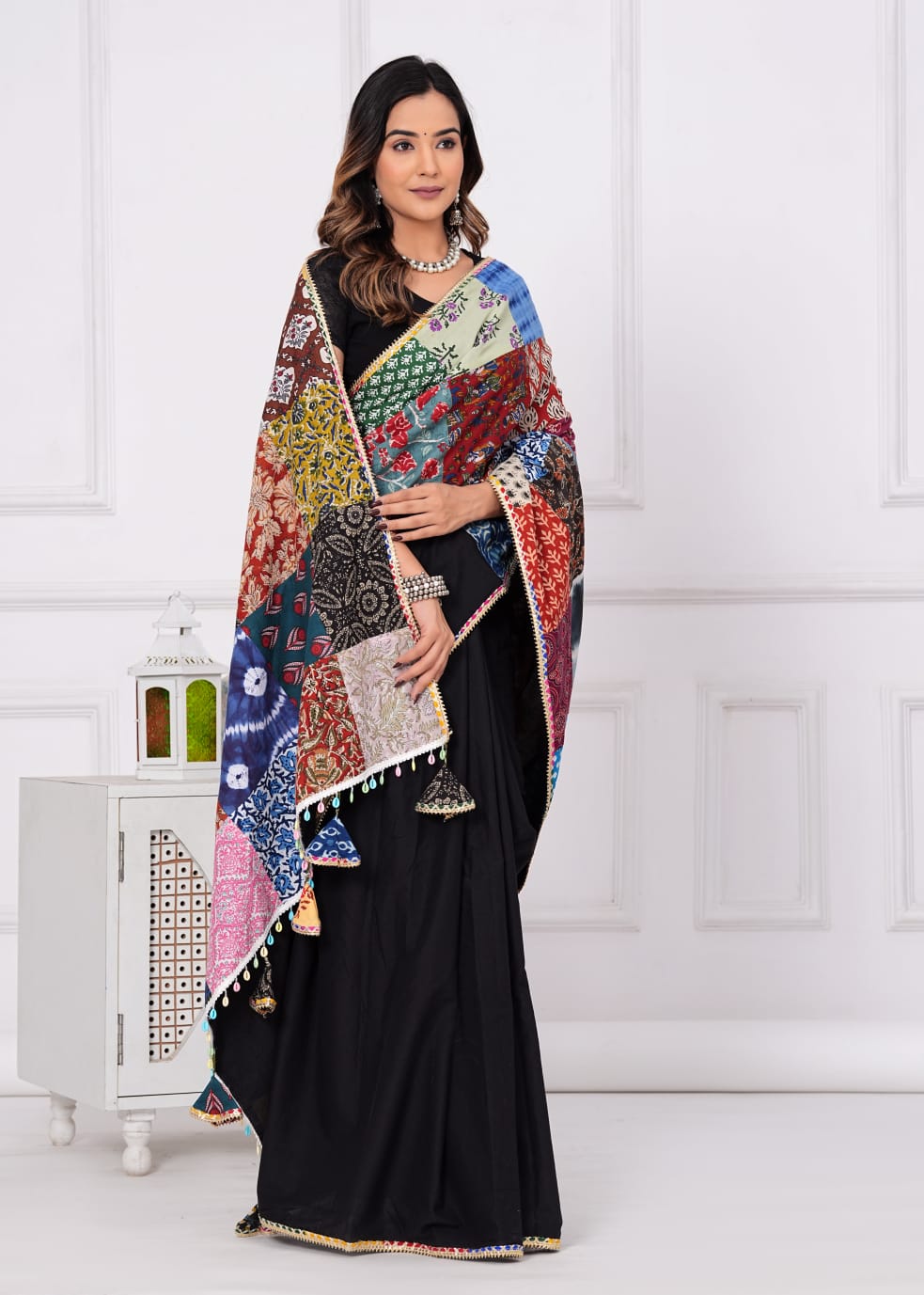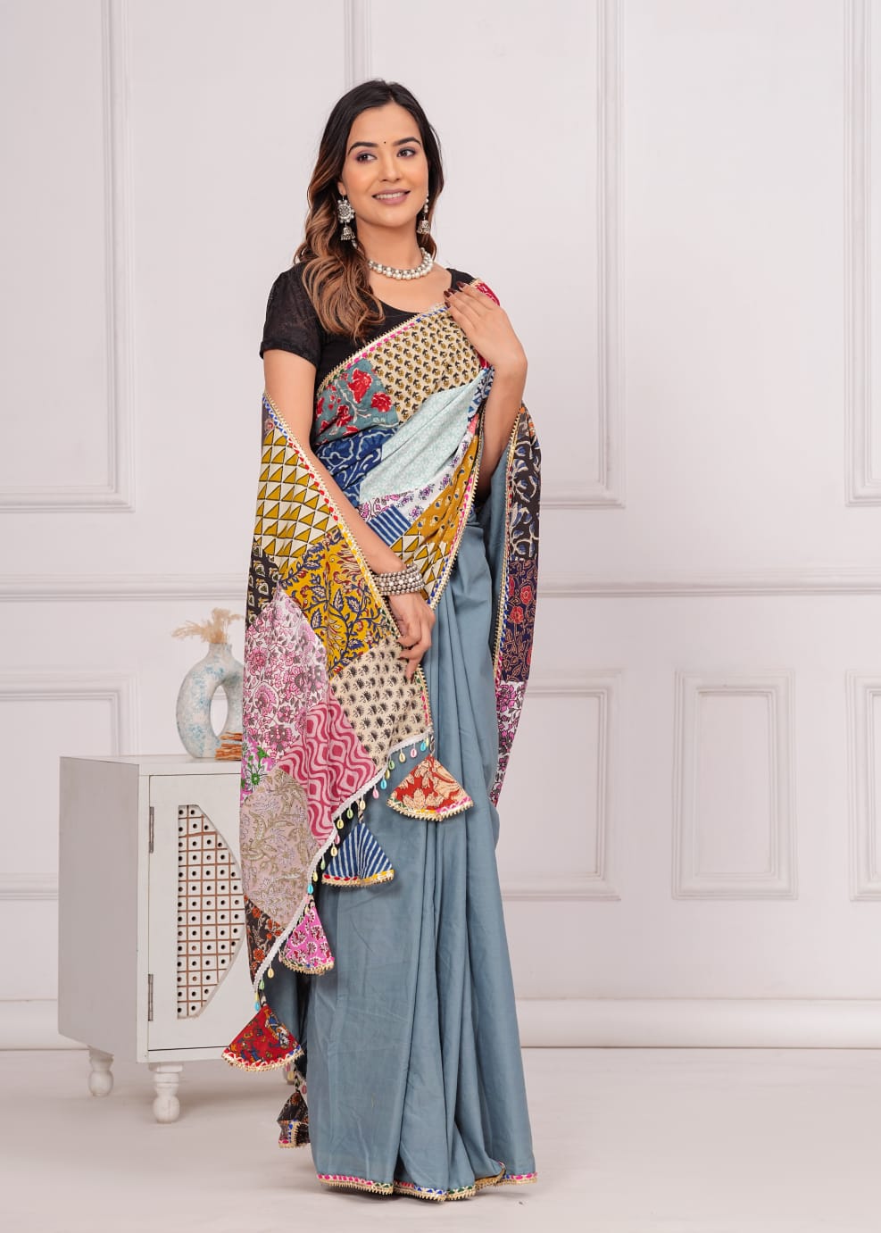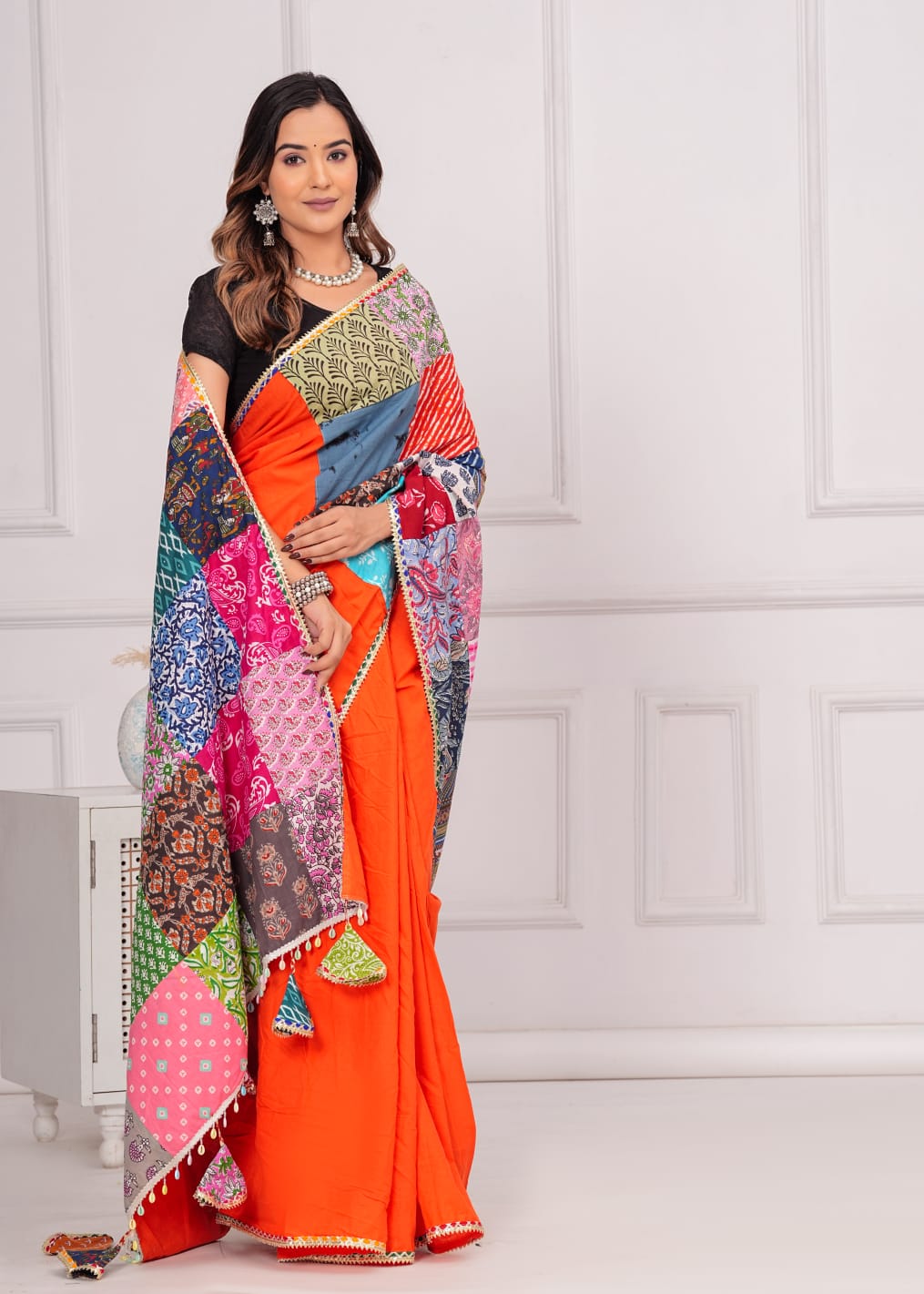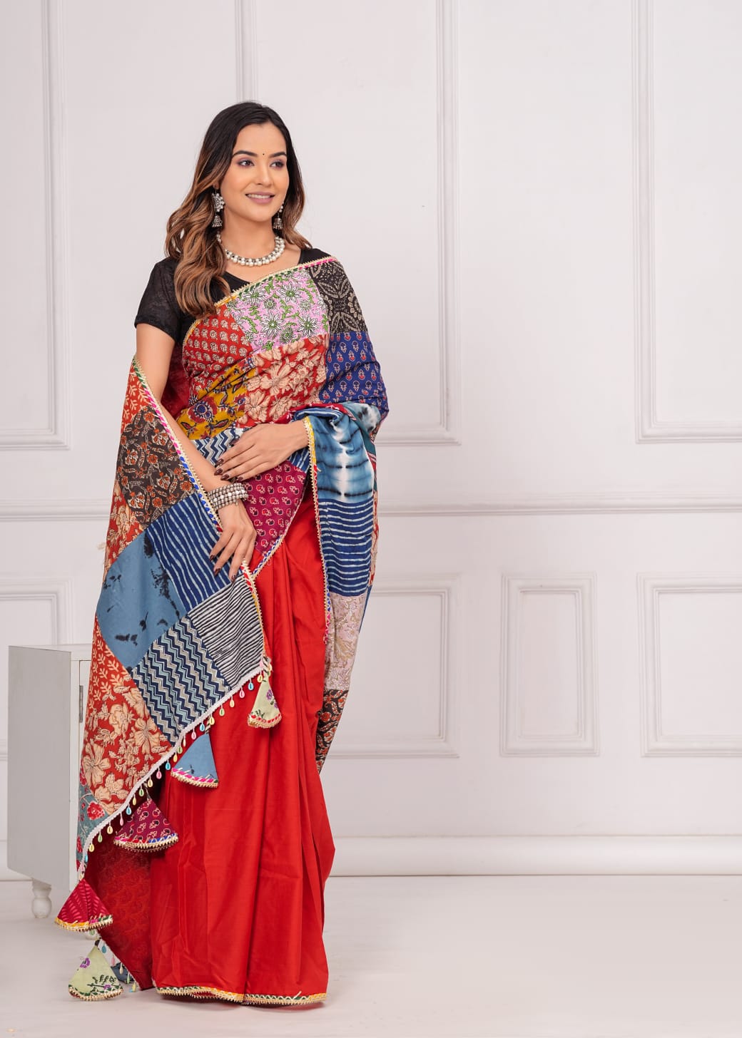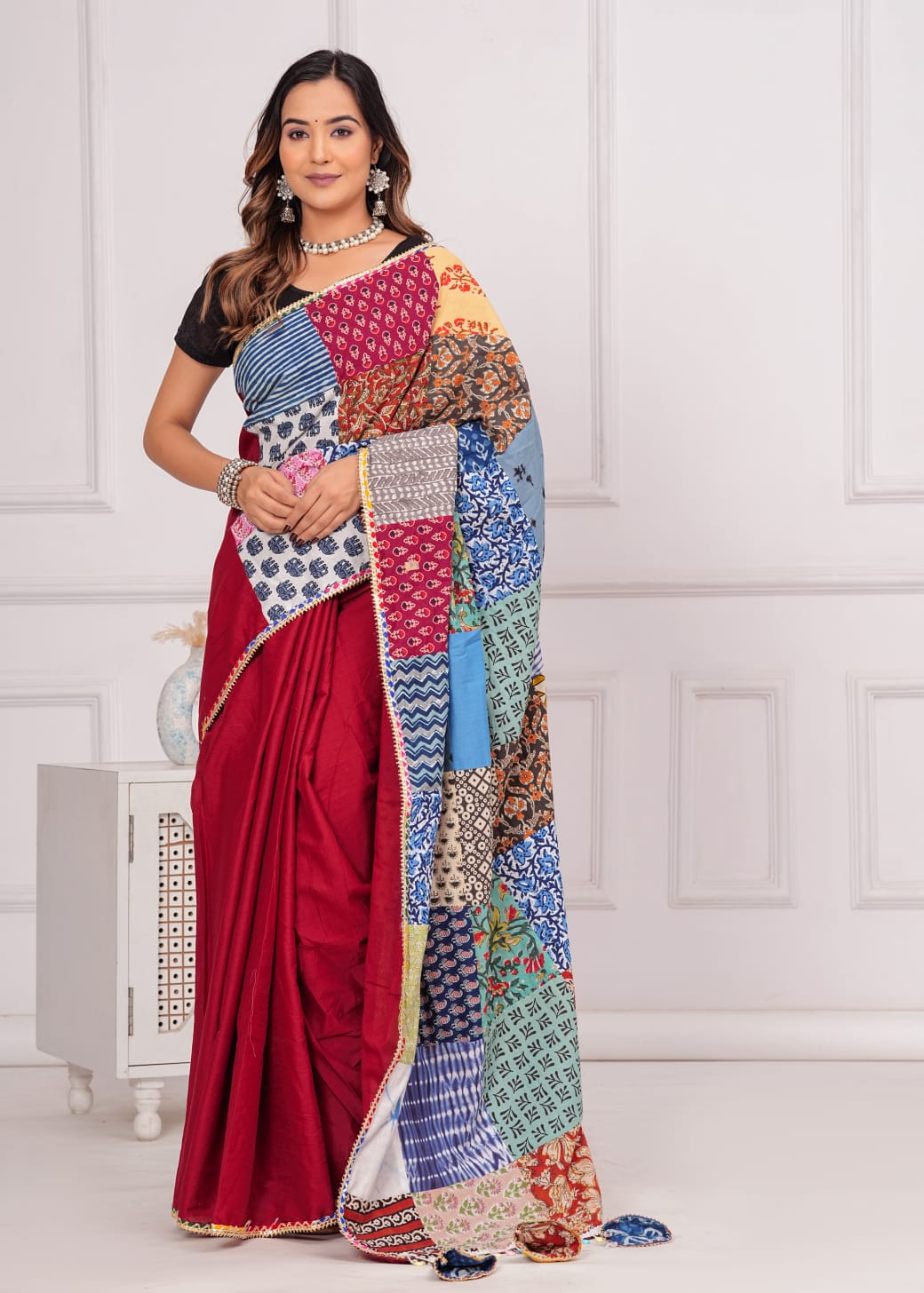 Made from 100% cotton, it combines sophistication with eco-consciousness. Each saree is distinctive with vibrant patches, promoting sustainable fashion. Specifications: