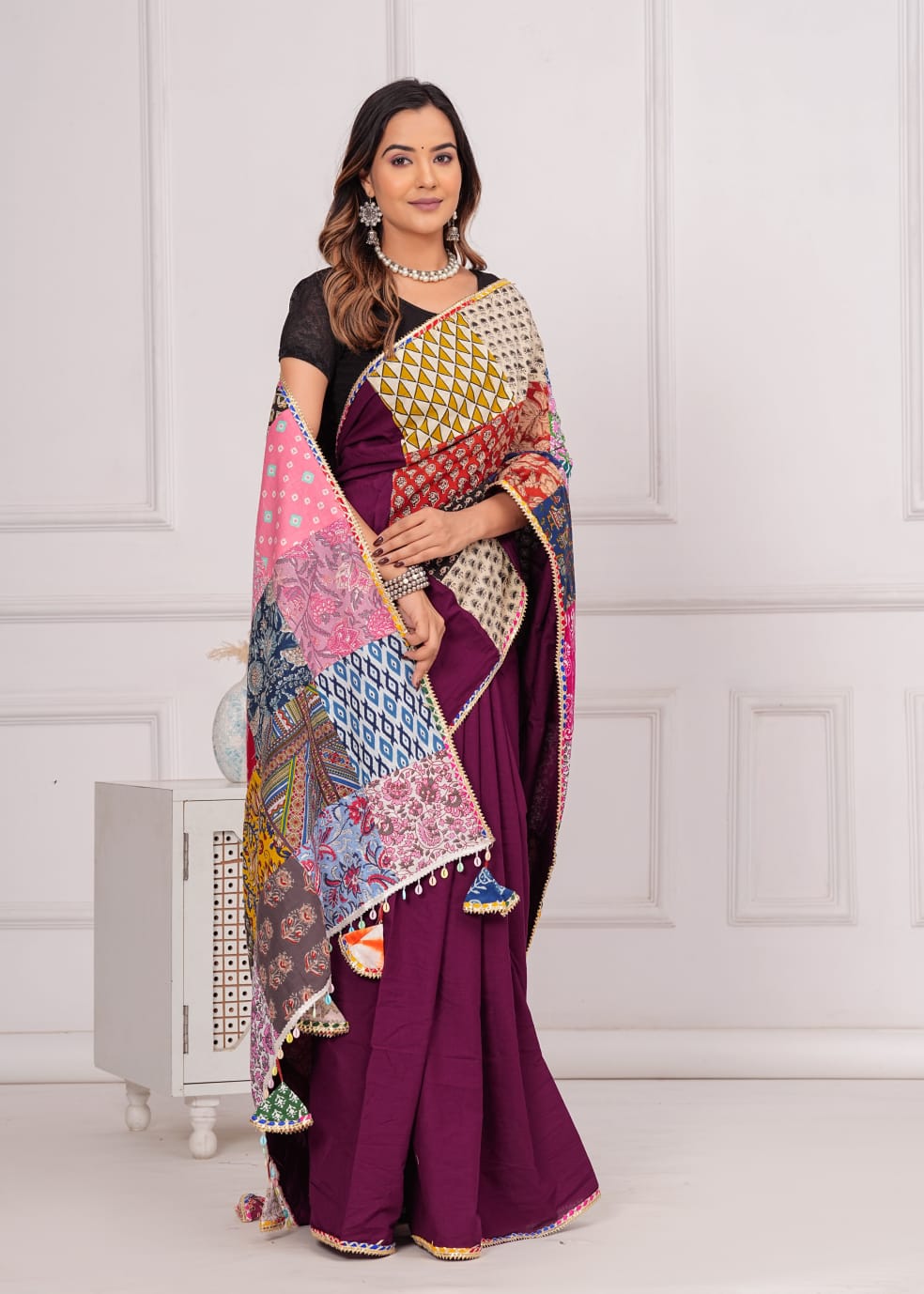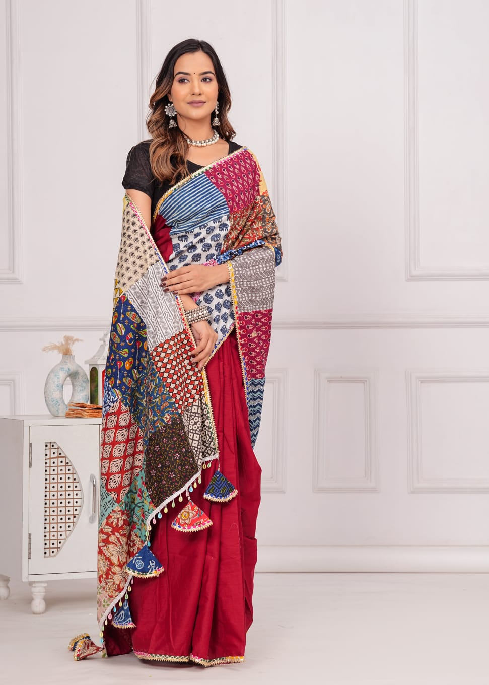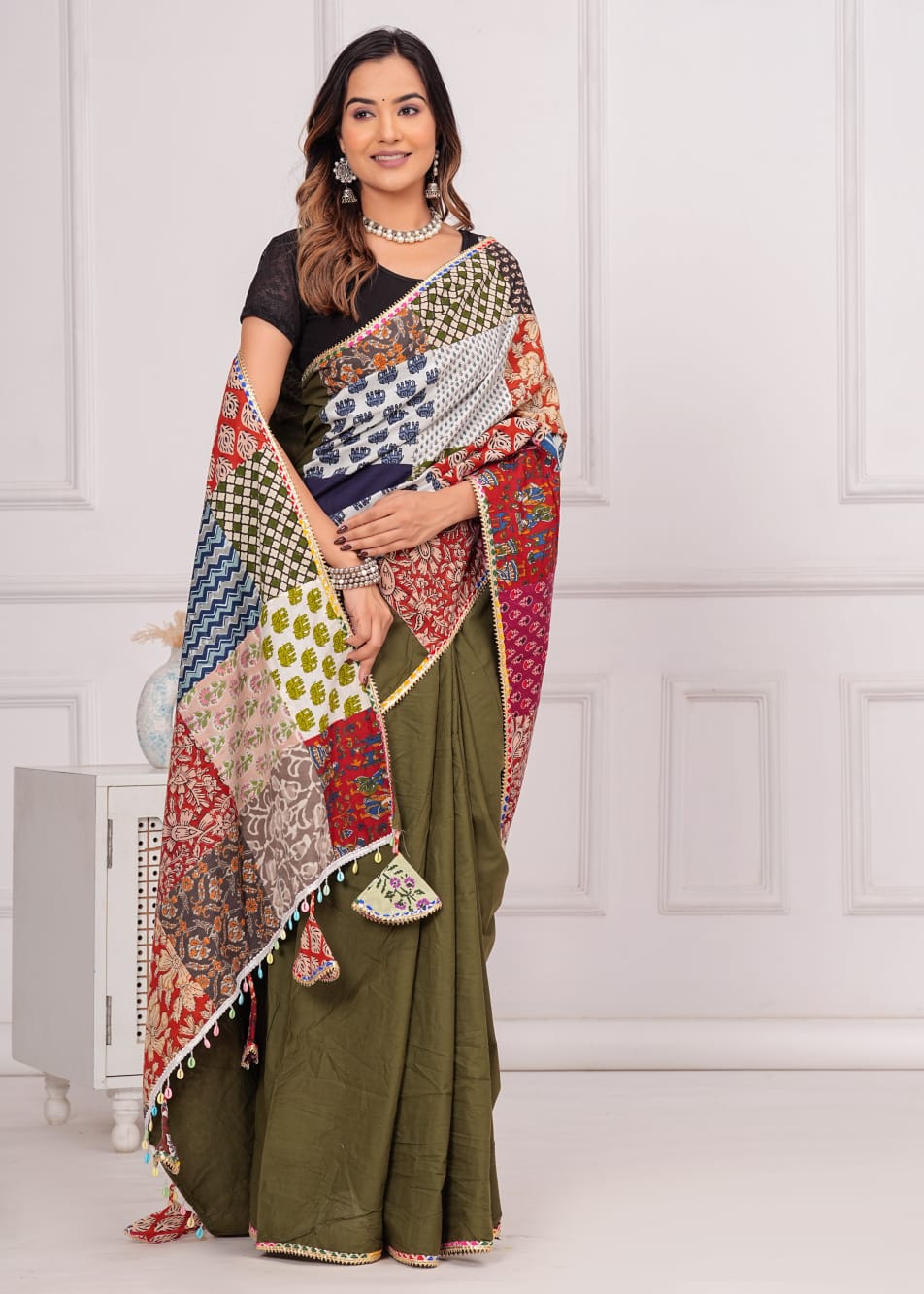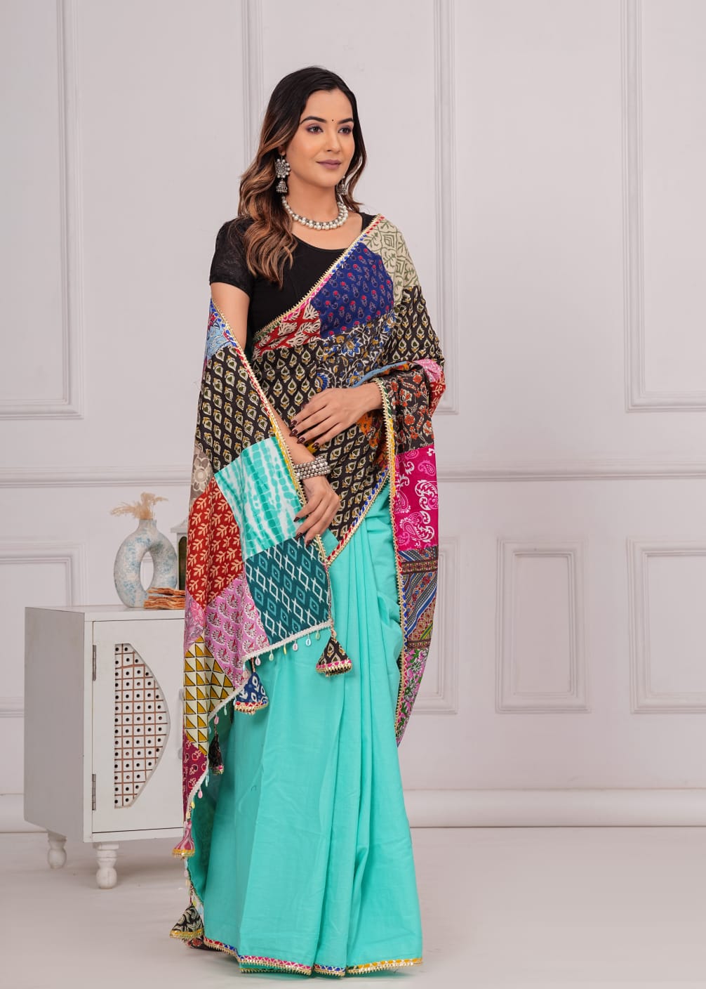 Made from 100% cotton, it combines sophistication with eco-consciousness. Each saree is distinctive with vibrant patches, promoting sustainable fashion. Specifications: